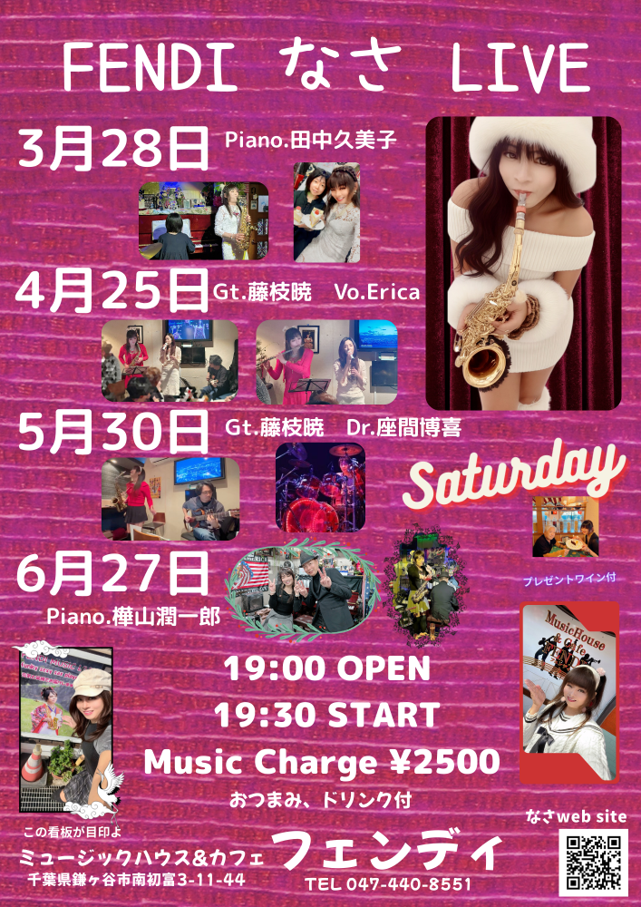 | 4月25日(土) | 鎌ヶ谷FENDI 19:000open 19:30start ¥2500 Sax.なさ Gt.藤枝暁 Guest.Erica(Vo) |