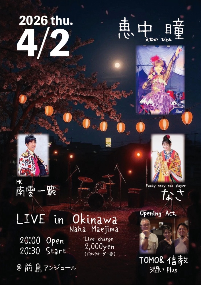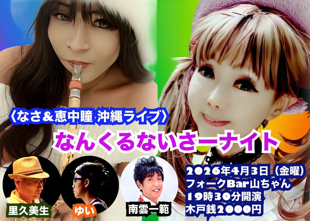 | 4月3日(金) | 沖縄コザ・フォークバー山ちゃん 19:00open 19:30start ¥2000 vo.恵中瞳 sax.なさ key.ゆい bs.里久美生 mc.南雲一範 |
