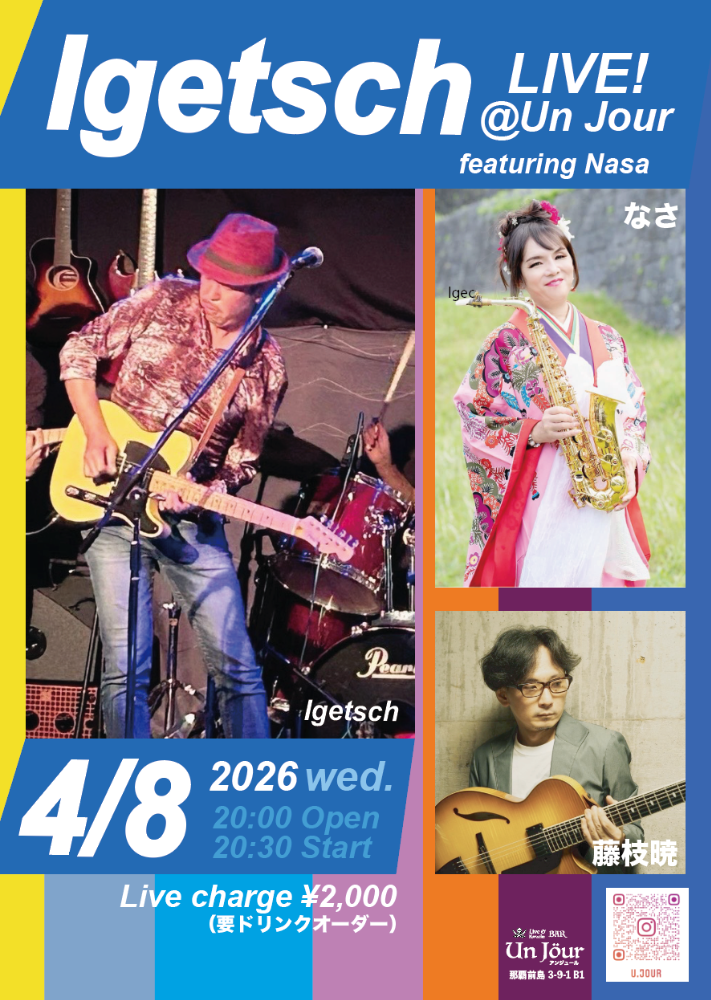 | 4月8日(水) | 那覇Un Jour 20:00open 20:30start ¥2000 Vo&Gt.イゲッチ Sax.なさ Gt.藤枝暁 Bs.木村信教 Dr.じゅんじゅん |