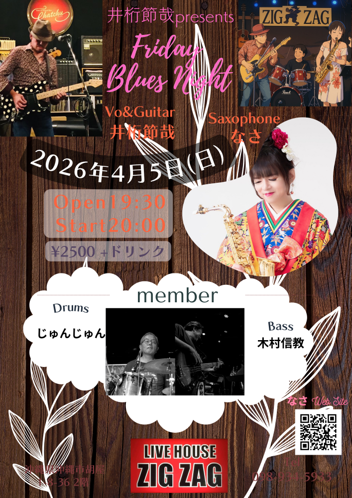 | 4月5日(日) | コザ・ジグザグ 19:30open 20:00start ¥2500 +ドリンク Vo&Gt.イゲッチ Sax.なさ Bs.木村信教 Dr.じゅんじゅん |