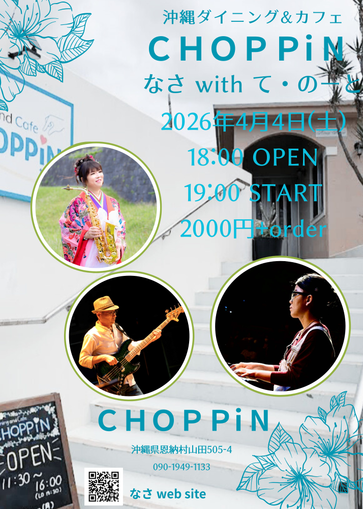 | 4月4日(土) | 恩納CHOPPiN 18:00open 19:00start ¥2000+order Sax.なさ Piano.ゆい Bs.里久実生 |