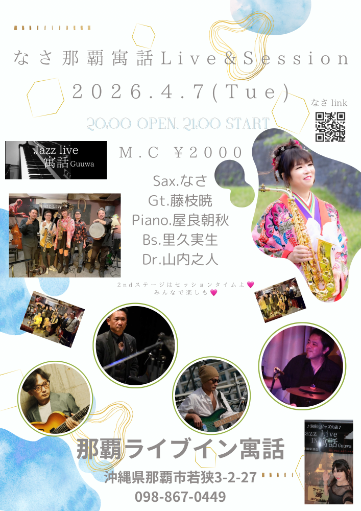 | 4月7日(火) | 那覇・寓話 20:00open 21:00start ¥2000 Sax.なさ Gt.藤枝暁 Piano.屋良朝秋 Bs.里久実生 Dr.山内之人 |