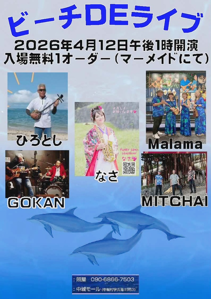 | 4月12日(日) | 中城モールビーチ 13:00〜16:00 Sax.なさ Vo.yoshimi Gt.藤枝暁 Bs.木村信教 Dr.かずま |