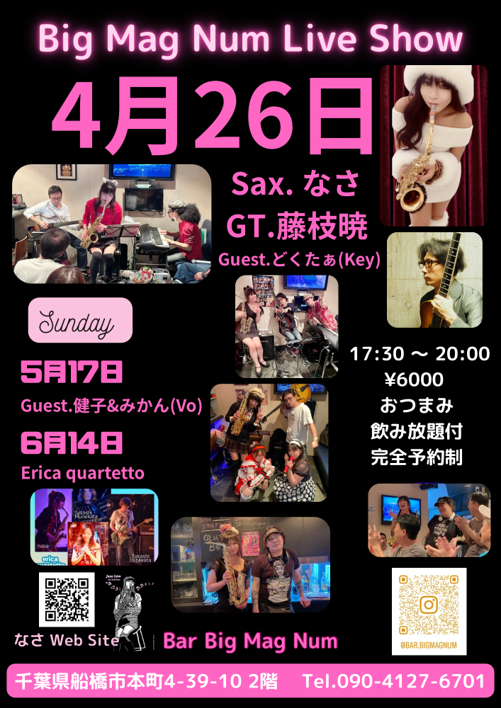 | 4月26日(日) | 船橋Big MagNum 17:30〜20:00 ¥6000(飲み放題、おつまみ付) Sax.なさ Gt.藤枝暁 Guest.どくたぁ(Key) |